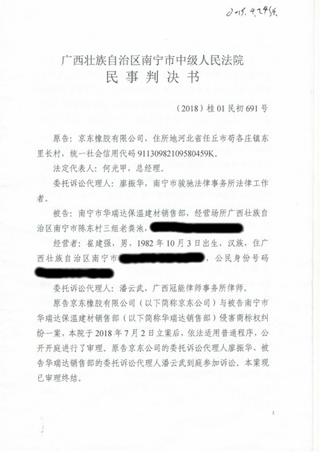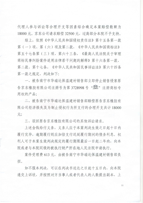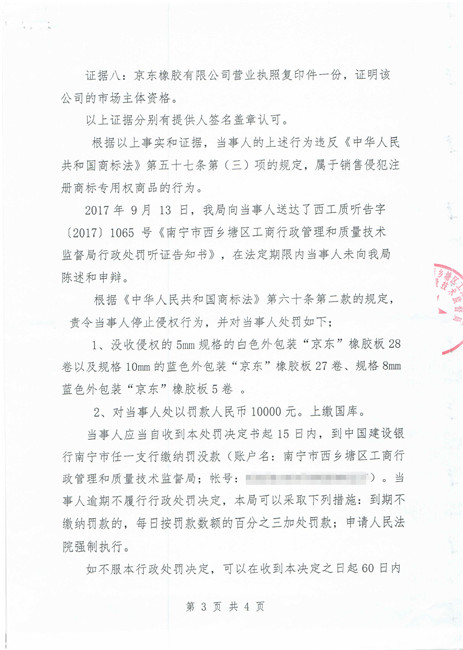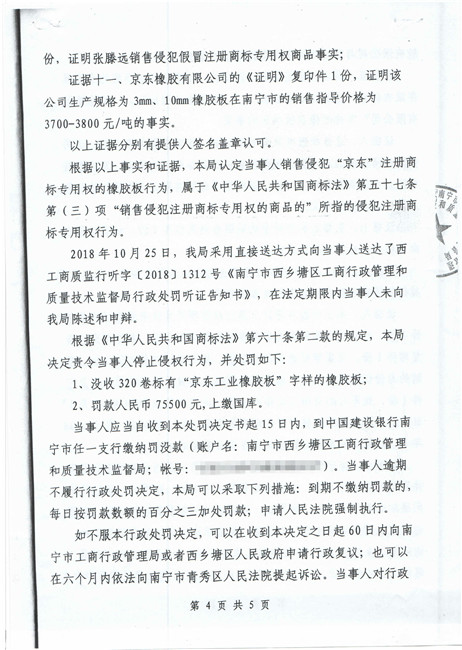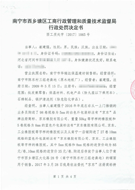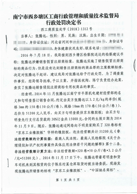 截止到2018年11月份,廣西南寧西鄉(xiāng)塘區(qū)工商行政管理和質量技術監(jiān)督局對假冒我公司商標侵權行為進行行政處罰:崔建強[西工質處字(2017)1065號] 10000元;張騰遠[西工商質監(jiān)處字(2018)1312號] 75500元。全部上繳國庫。并對這兩起案件我公司也進行了司法賠償判決。